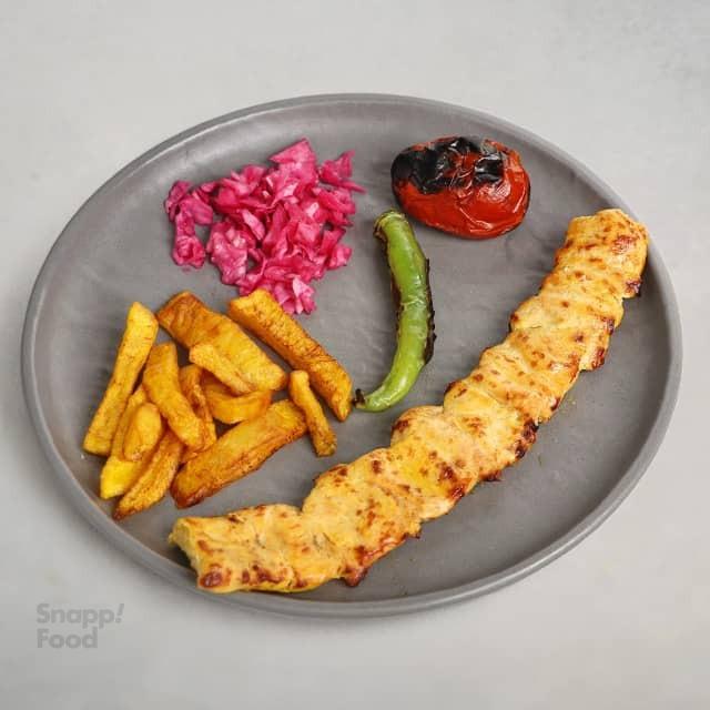 یک سیخ جوجه کباب سینه مرغ زعفرانی 270 گرمی، دورچین: گوجه کبابی، فلفل کبابی، پیاز، سیب زمینی سرخ شده، یک عدد نان لواش