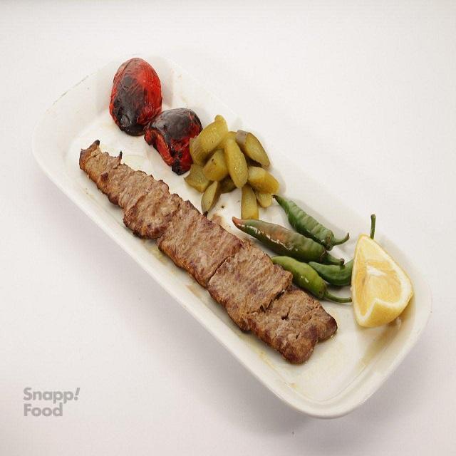 یک سیخ کباب لقمه مخلوط گوشت گوساله و گوسفندی 270 گرمی ، دورچین : گوجه کبابی ، فلفل کبابی ، پیاز ، سیب زمینی سرخ شده ، یک عدد نان لواش