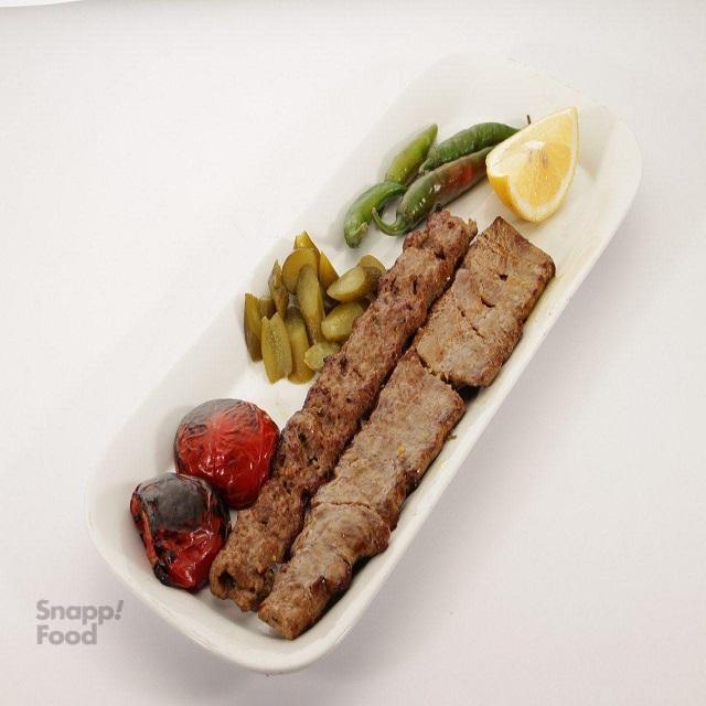 یک سیخ کباب کوبیده مخلوط گوشت گوساله و گوسفندی 110 گرمی ، دورچین : گوجه کبابی ،فلفل کبابی ، پیاز ، سیب زمینی سرخ شده ، یک عدد نان لواش