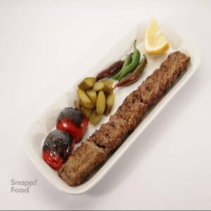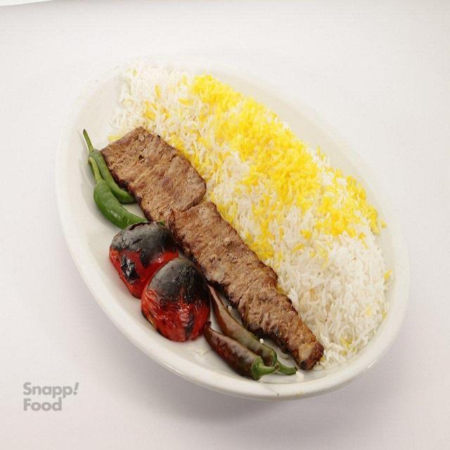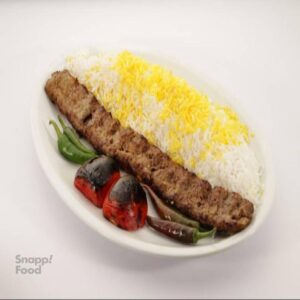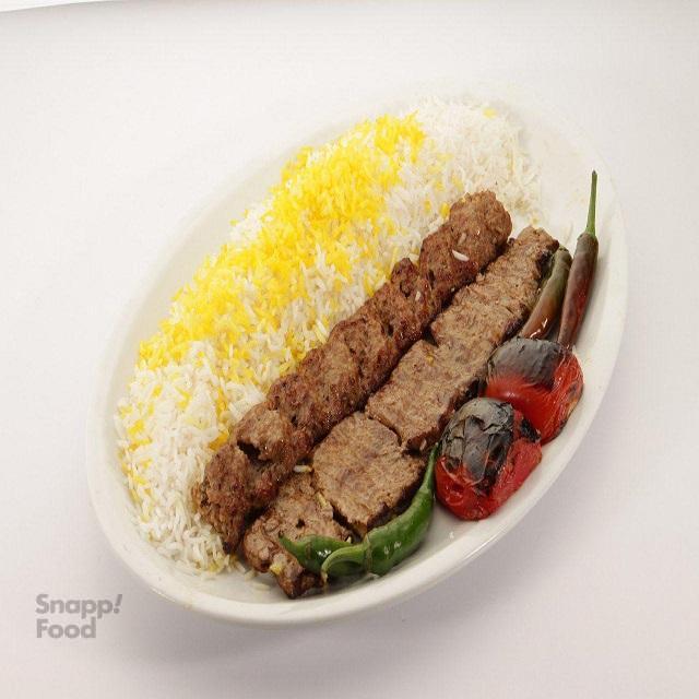 یک سیخ کباب کوبیده مخلوط گوشت گوسفندی و گوساله 110 گرمی ،300 ،350 گرم برنج خارجی ،کره ، پیاز ، نان لواش