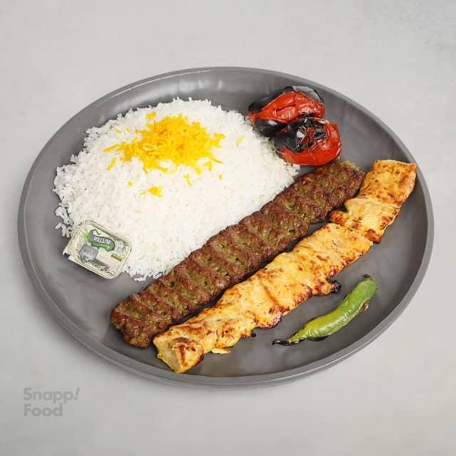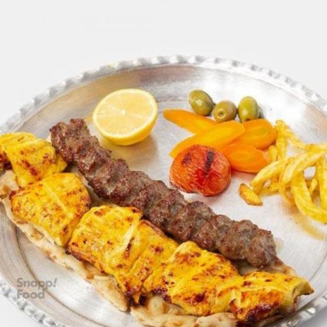 یک سیخ جوجه کباب سینه مرغ زعفرانی 150 گرمی ، یک سیخ کباب کوبیده مخلوط گوساله و گوسفندی 110 گرمی ، دورچین : گوجه کبابی ، فلفل کبابی ، پیاز ، سیب زمینی سرخ شده ، یک عدد نان لواش
