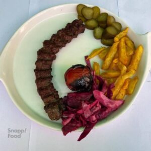یک سیخ کباب کوبیده مخلوط گوشت گوسفندی و گوساله 110 گرمی ، دورچین : گوجه کبابی ، کلم قرمز ،خیارشور ، سیب زمینی ، پیاز ، نان لواش